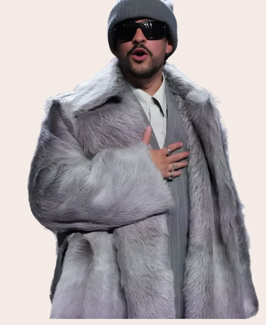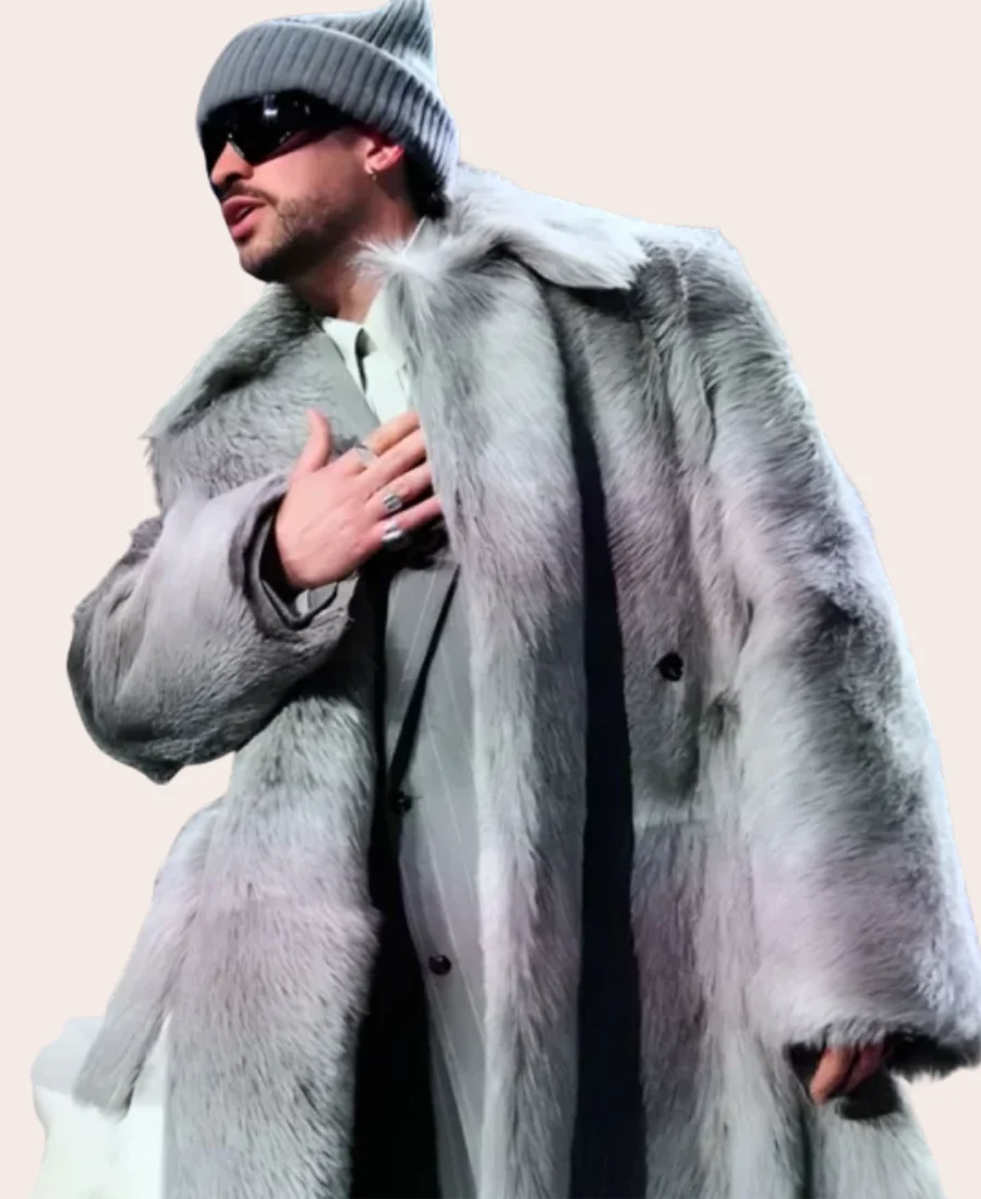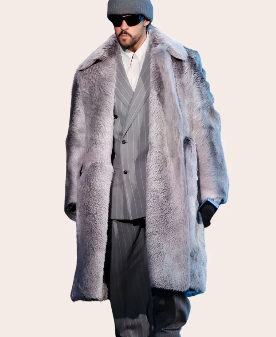 Super Bowl LX Halftime Show Bad Bunny Grey Fur Trench Coat