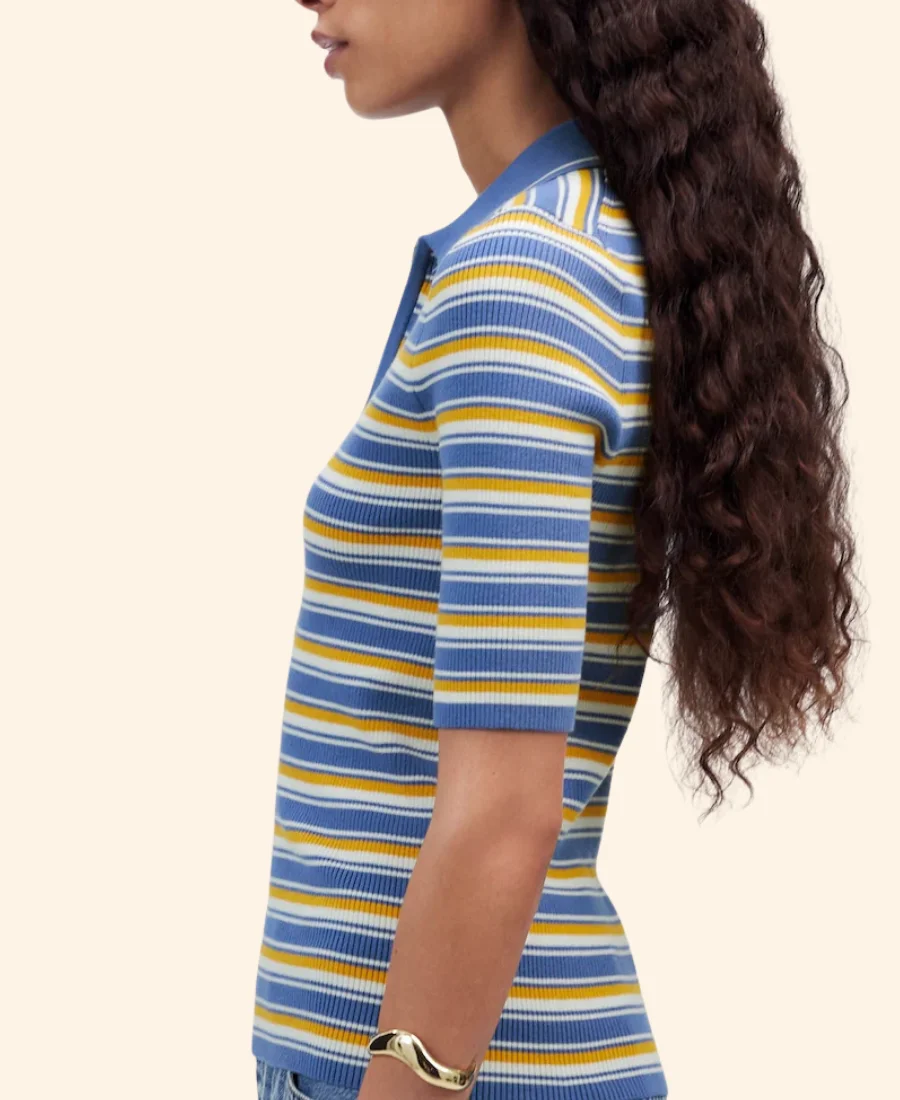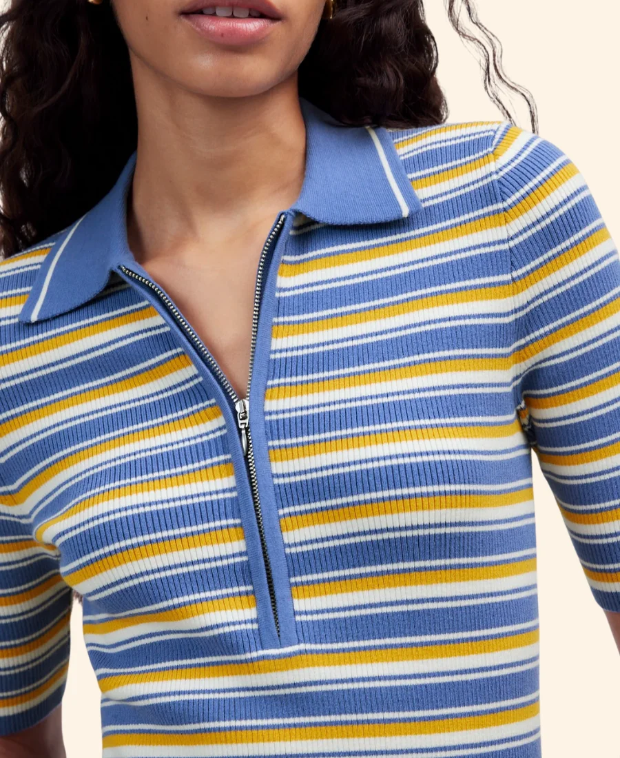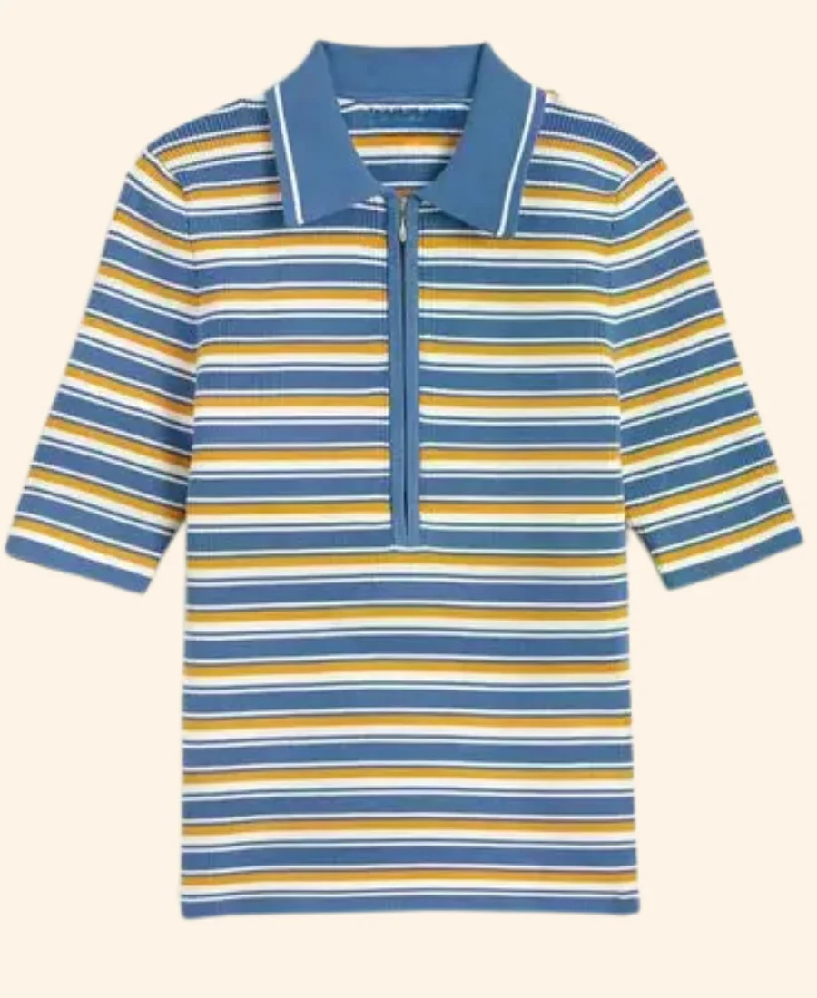 Stephanie Koenig English Teacher Season 02 Gwen Sanders Stripped Quarter Zipper Blue Cardigan