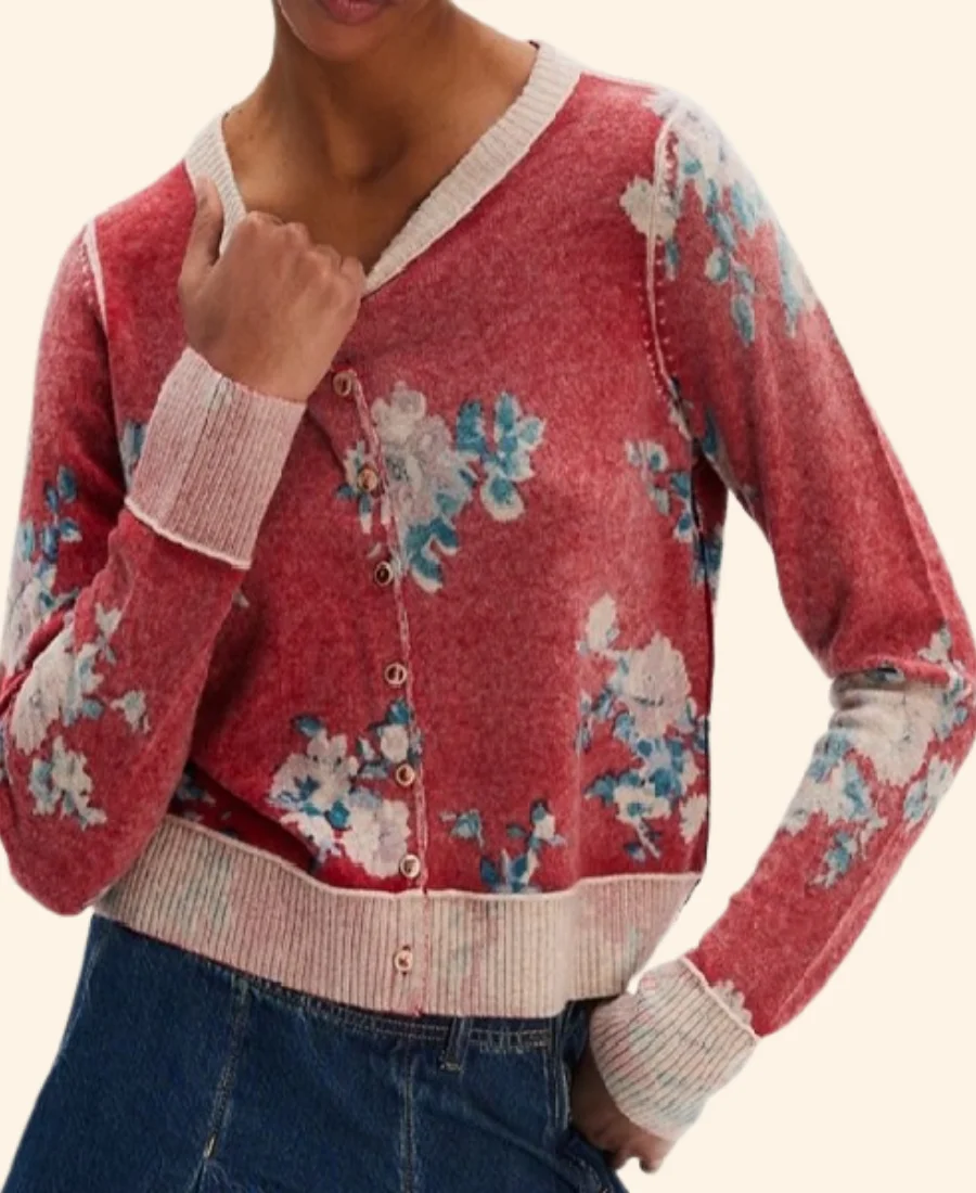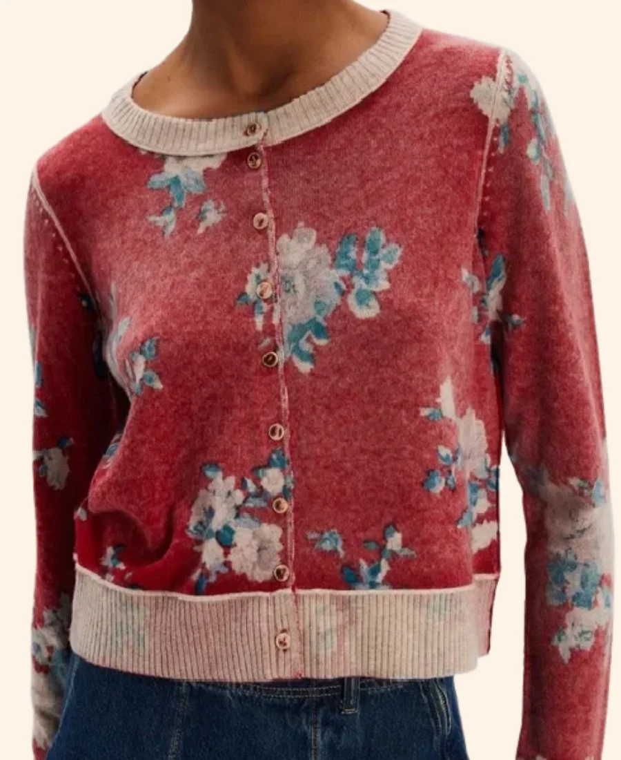 Cassandra Sawtell Murder In A Small Town Season 02 Steph AlbergĀ Floral Print Red Cardigan
