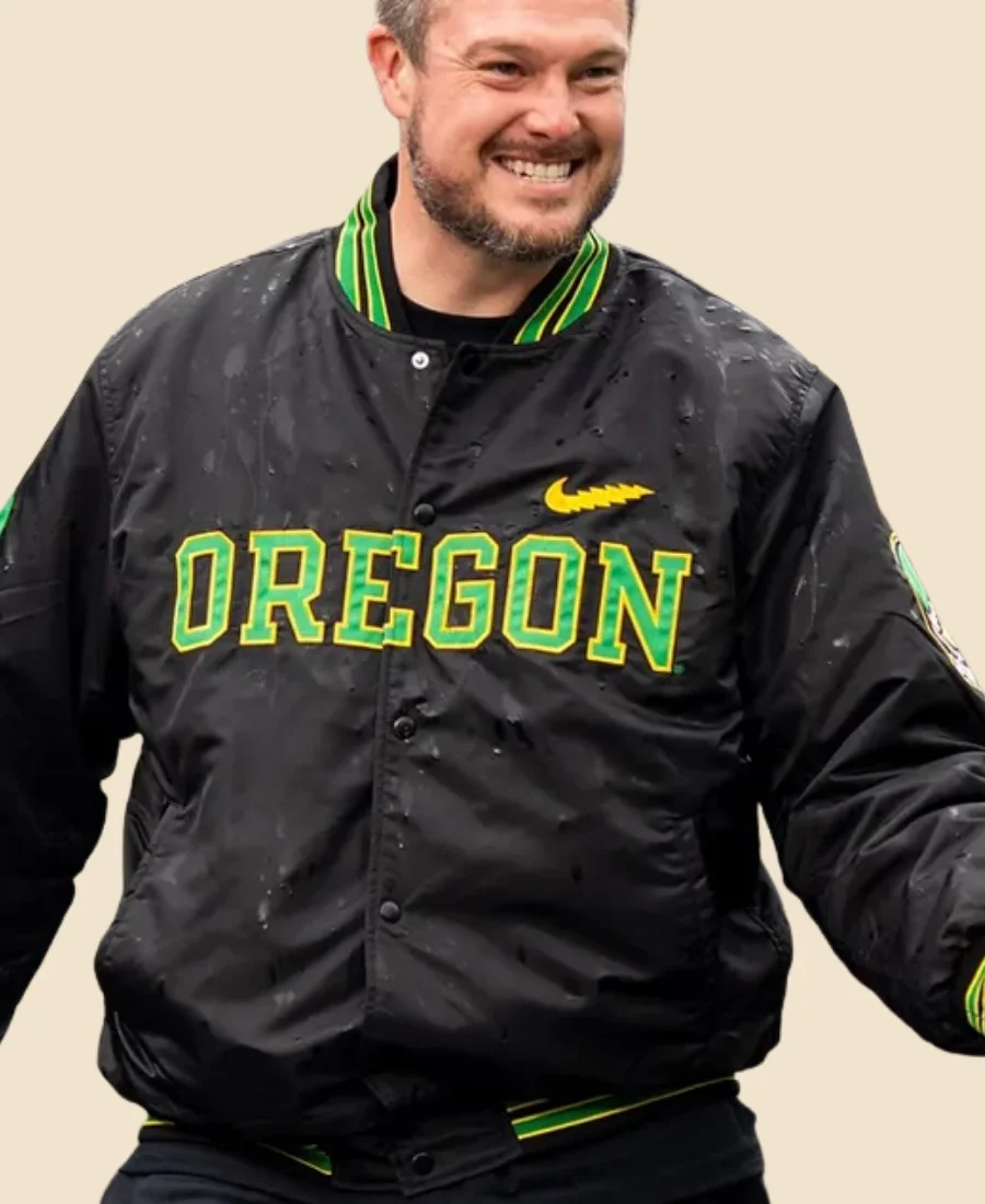 NCAA Oregon Ducks Football Coach Dan Lanning Black Satin Varsity Jacket